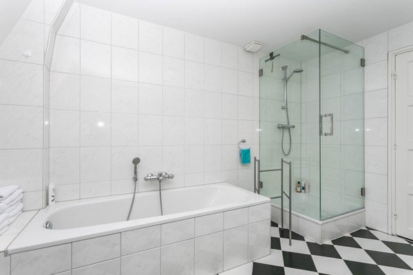 Luxe, ruime badkamer voorzien van douche, ligbad en dubbele wastafel met grote spiegel.