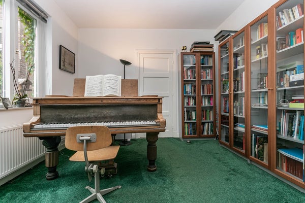 Via de overloop bereikt u de piano-/studeerkamer, die toegang geeft tot twee ruime bergruimtes, inclusief een vriezer.