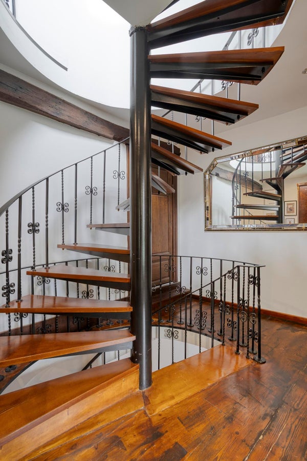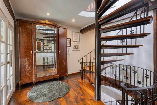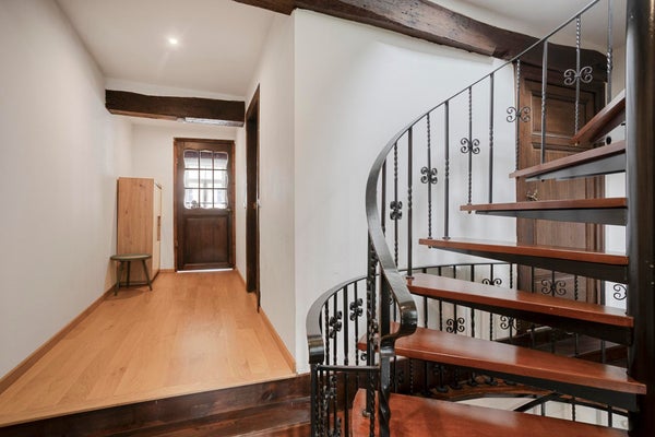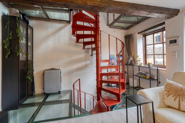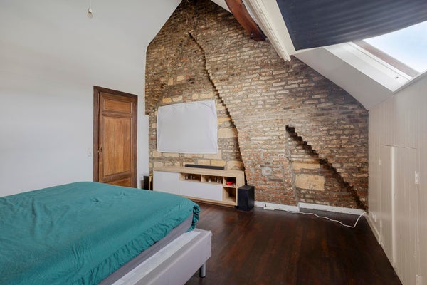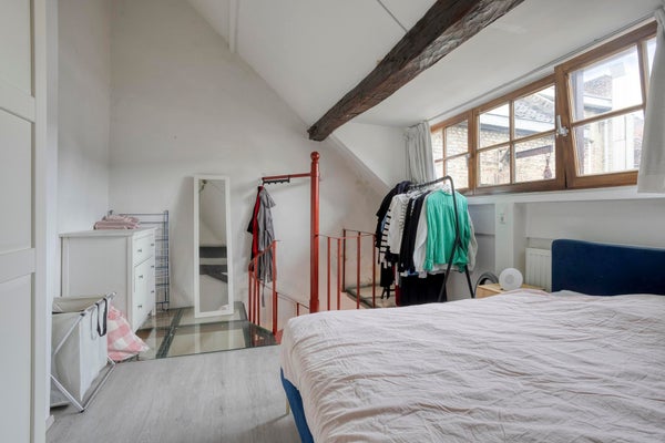 - Derde verdieping (zolder): royale slaapkamer met zichtbare houten spanten, wat een prachtig authentiek accent vormt.