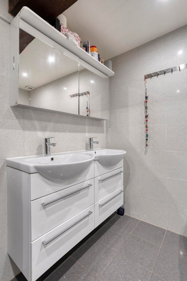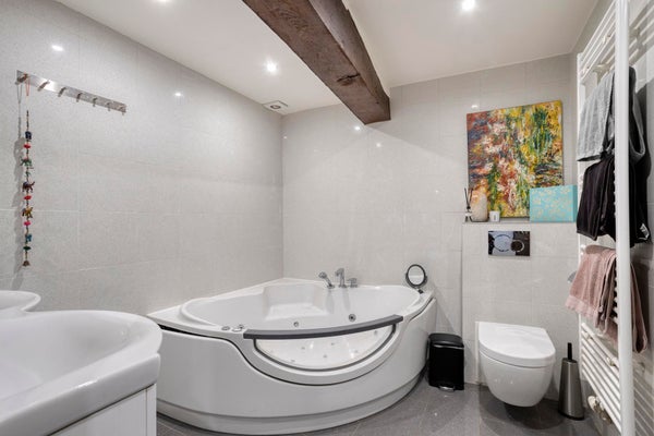 - Tweede verdieping: twee slaapkamers, een separaat toilet, een ruime badkamer voorzien van inloopdouche, extra groot bad met bubbelfunctie en blauwe verlichting, dubbele wastafel, en een wasruimte met de CV-installatie (combi-ketel, bouwjaar 2028).