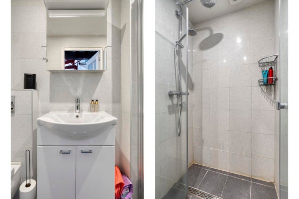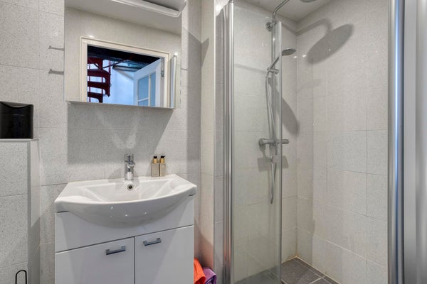 - Begane grond: eenvoudige keuken, badkamer met douche, wastafel en toilet.