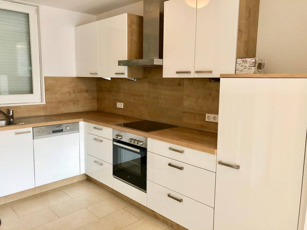 Hal met toilet, lichte woonkamer (ca. 30 m²) voorzien van een mooie nieuwe hoekbank en een open keuken (ca. 7 m²). De keuken is uitgerust met een spoelbak, 4-pits elektrische kookplaat, koelkast met vriezer, oven en vaatwasser. Vanuit de woonkamer is er toegang tot de tuin (ca. 30 m²) en de privé garage (ca. 16 m²).
