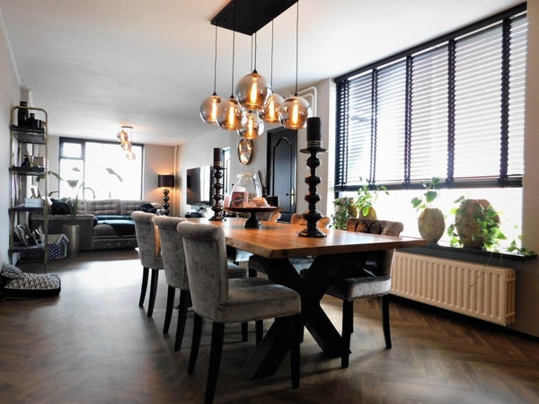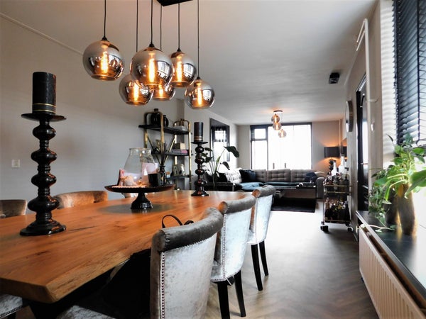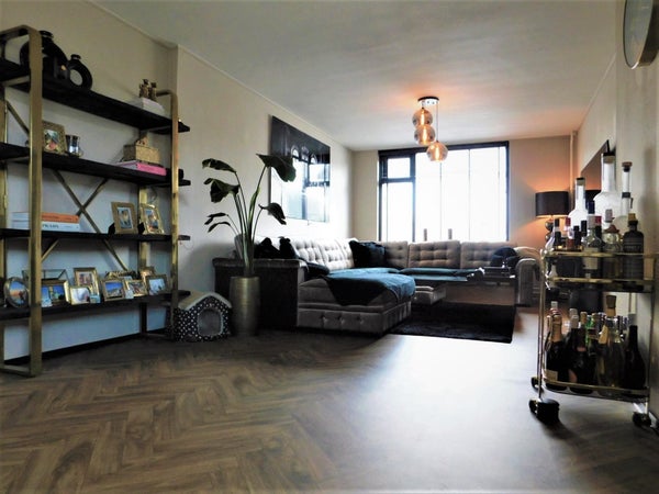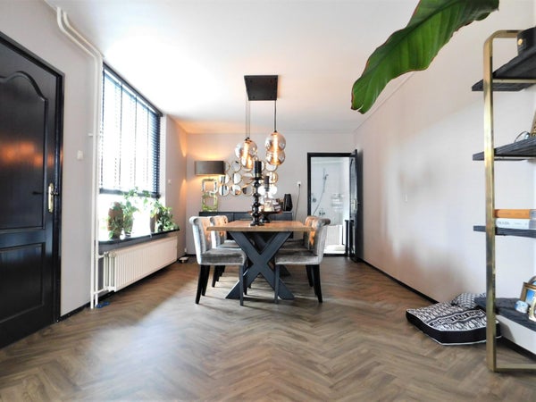 De royale woonkamer met pvc visgraat vloer biedt ruimte voor een ruime zithoek en eettafel. Vanuit de woonkamer kunt u zich begeven naar de wasruimte.