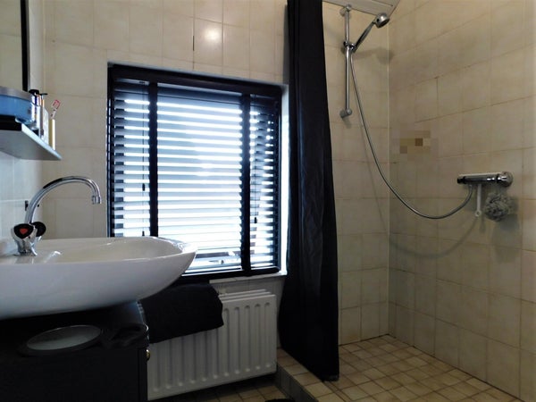 Vanuit de hal op de eerste verdieping kunt u zich begeven naar de badkamer met douche, wastafel en spiegel.