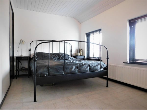 Een royale slaapkamer met natuurlijk lichtinval en een vloer gemaakt van zeil. De slaapkamer heeft een ingebouwde kast.