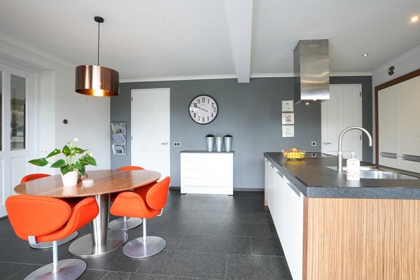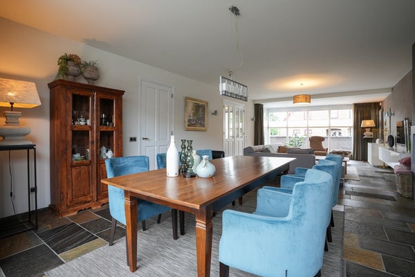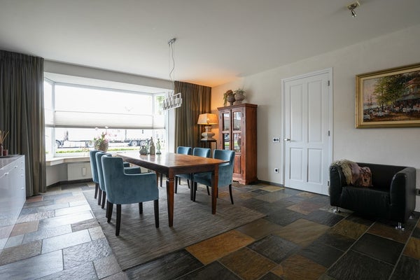 Rechts in de hal is een deur naar de sfeervolle woonkamer, waar een donkere leisteen vloer ligt. De kleuren op de wanden en de schouw zijn zorgvuldig afgestemd op de vloer. Zowel het zitgedeelte als het eetgedeelte heeft een ruime opzet, met een gashaard als centrale plek. Geniet van de sfeer, de ruimte en de goede lichtinval.
