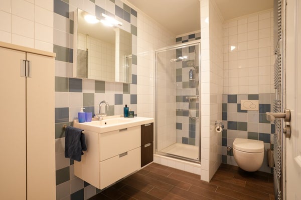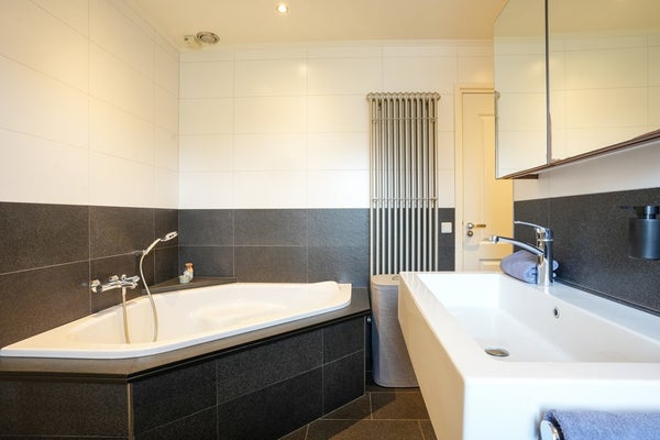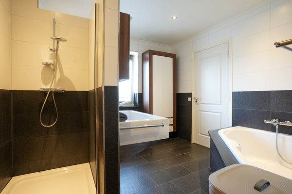 Naast de master bedroom is de eerste badkamer, die ook toegankelijk is vanaf de overloop. Deze fraaie ruimte is ingedeeld met een hoekbad, een separate douche, een nis met toilet, een hoge kast en een wastafelmeubel. Aan de andere zijde van de overloop is de tweede badkamer met een douche, een wastafelmeubel, een hoge kast en een toilet.