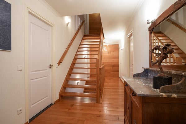 Dit fraaie woonhuis heeft een dubbele entree aan de kant van de Rijksweg. In het linkerdeel is de entree van het woongedeelte en bij het rechterdeel is de entree van het kantoorgedeelte. Eerst gaan we naar het woongedeelte, waar u als eerste in de zeer royale ontvangsthal staat. Hier zijn de meterkast, het gastentoilet, een maatwerk garderobe en de prachtige trap naar de eerste verdieping.