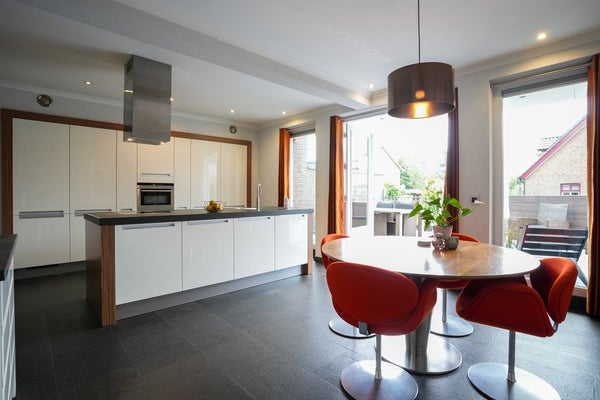 De eetkeuken is een stijlvolle ruimte met openslaande deuren naar het terras. Er is genoeg plek voor een eettafel en de keukenopstelling met kook-/spoeleiland is van topkwaliteit. Aan bergruimte is geen gebrek en de inductie kookplaat, afzuigkap, Quooker, vaatwasser, combi-oven, koelkast en vriezer zijn ingebouwd. Naast de keuken is een praktische bijkeuken, waar een pantry met een spoelbak staat.