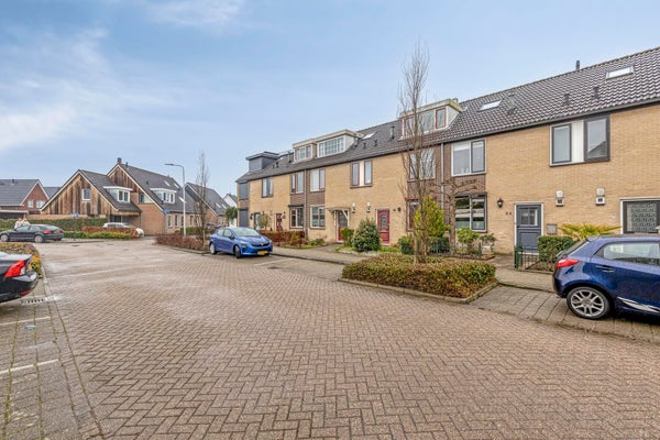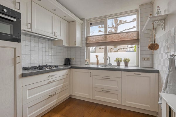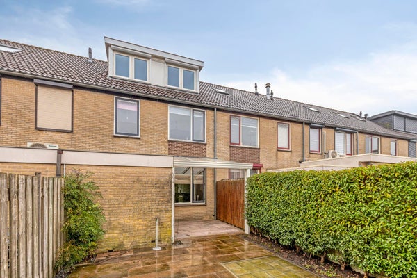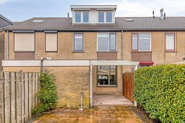 Vanuit de woonkamer loop je door naar de bijkeuken, die toegang biedt tot de ruime achtertuin met overkapping en een schuur. De tuin grenst direct aan een speeltuin aan de achterzijde van de woning, wat deze woning bijzonder geschikt maakt voor gezinnen met kinderen.