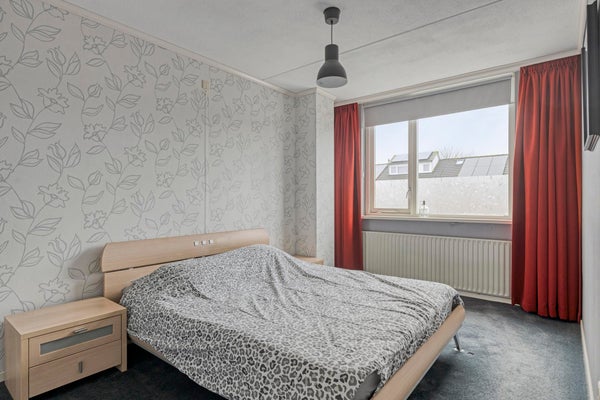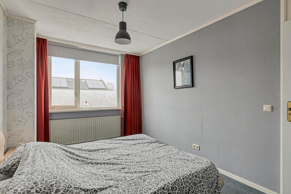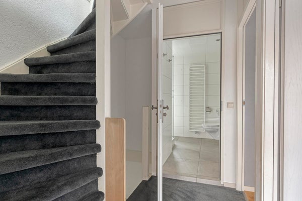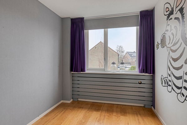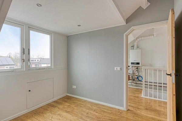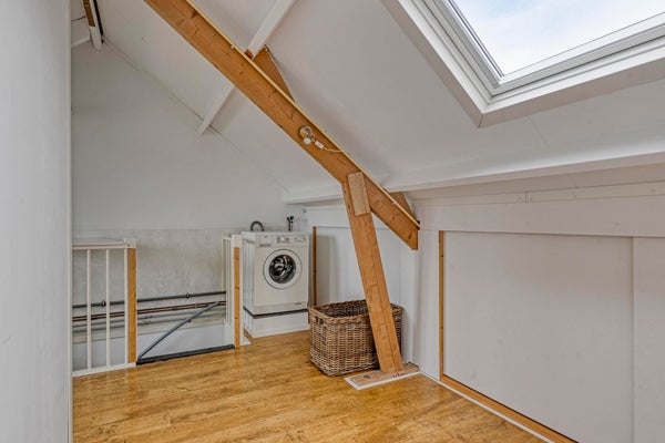 De tweede verdieping biedt plaats aan de vierde slaapkamer van de woning. Daarnaast bevindt zich hier de aansluiting voor de wasmachine en is er voldoende ruimte om de was op te hangen of extra bergruimte te creëren. De kamer biedt bovendien volop bergruimte, fraai weggewerkt achter schuifdeuren, wat zorgt voor een rustige en opgeruimde uitstraling.