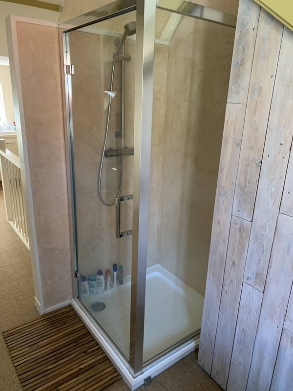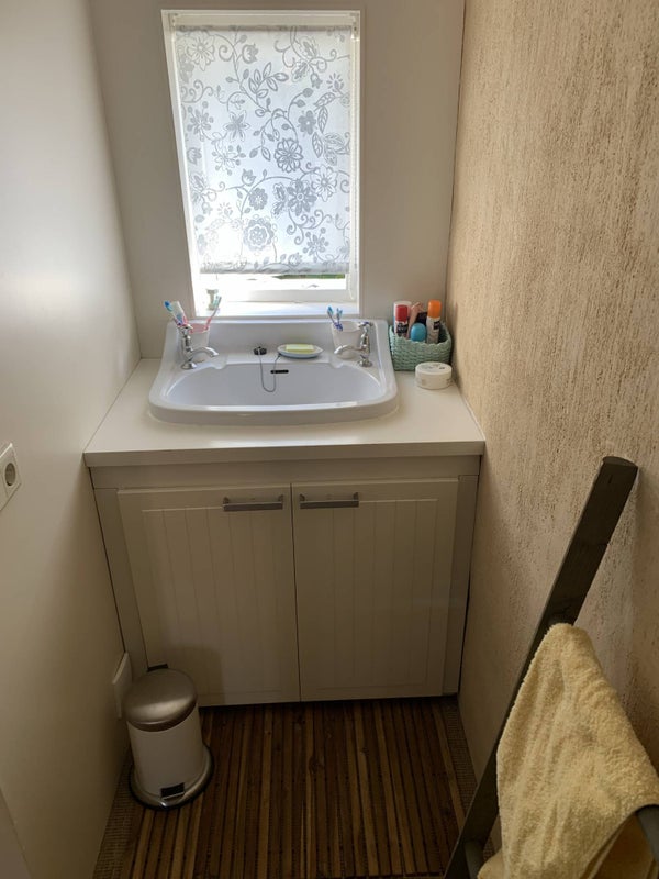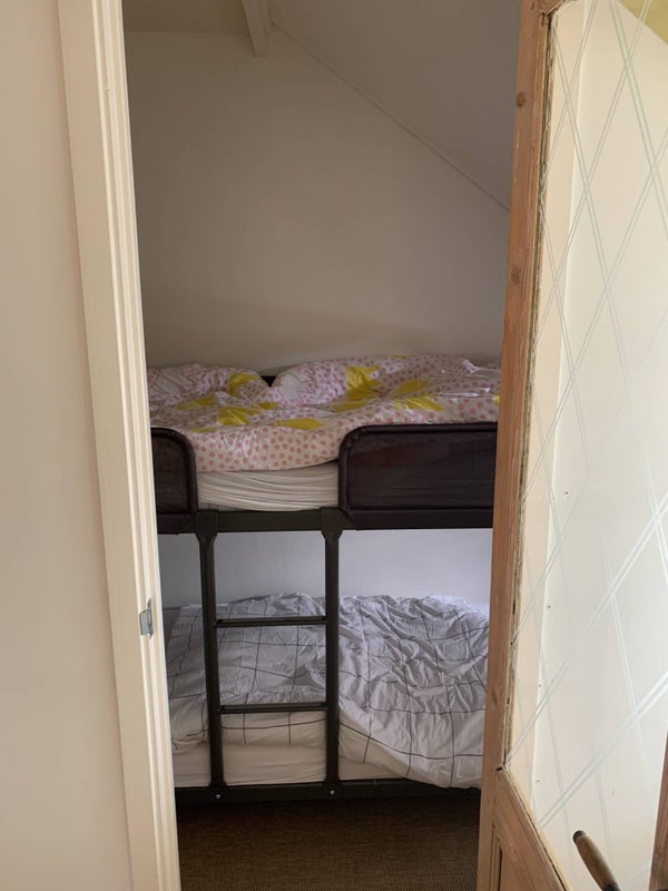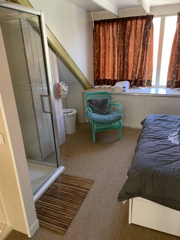 De woning beschikt over een ruime hoofdslaapkamer met eigen douche en wastafel, en een tweede slaapkamer met stapelbed – ideaal als logeerkamer of werkkamer.
