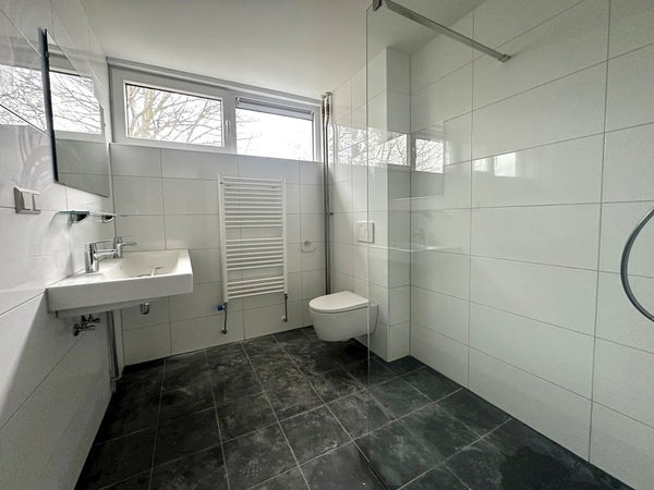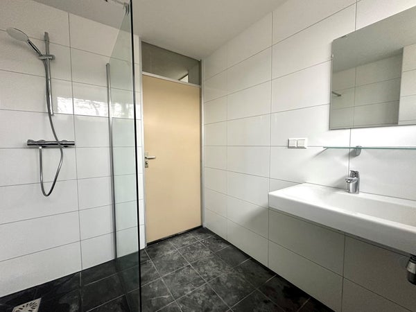 De badkamer is recent volledig vernieuwd en voorzien van een inloopdouche, dubbele wastafel met spiegel, toilet en handdoekenradiator.