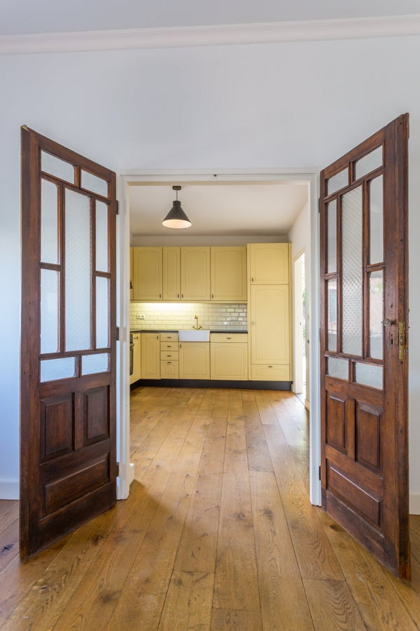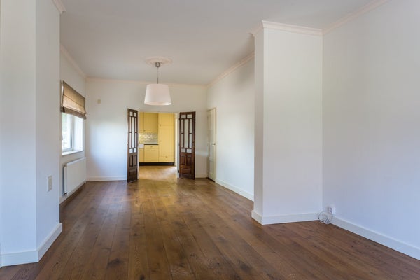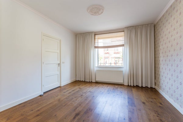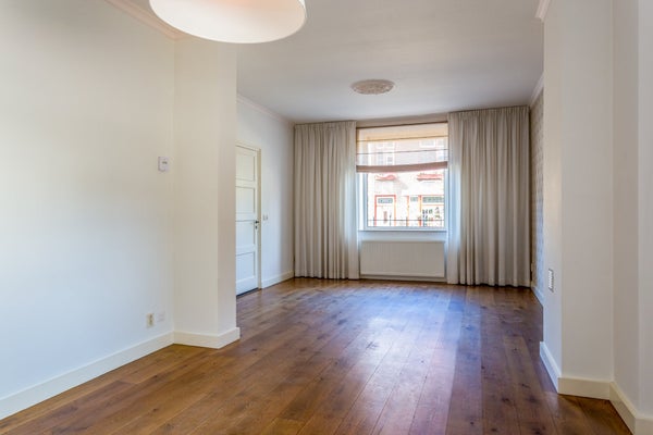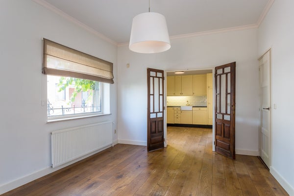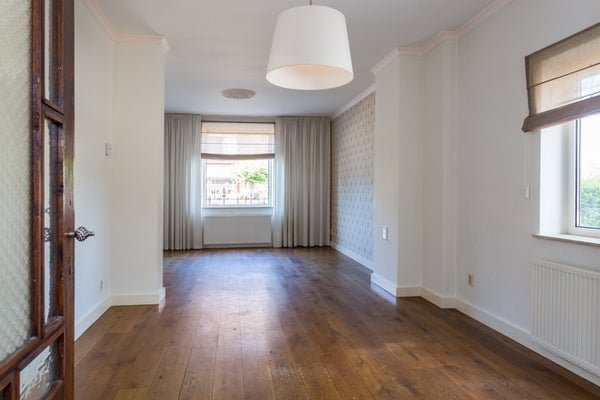 De ruime woonkamer beschikt over veel lichtinval en is voorzien van een mooie houten vloer.
