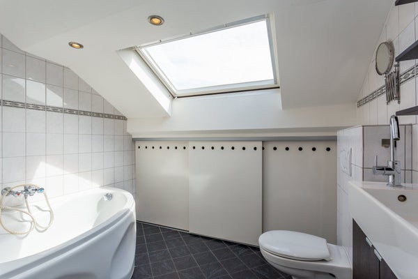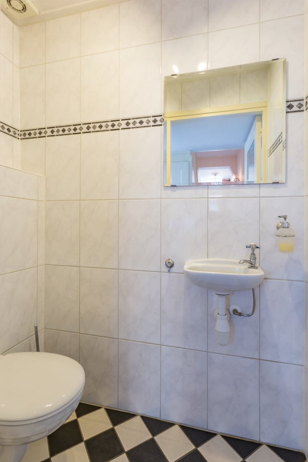 De badkamer is vv. een bad/douche combinatie, een extra toilet, wastafel met spiegel en opbergkastjes.