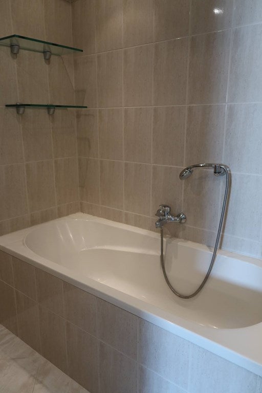 Badkamer met ligbad, badkamermeubel, extra toilet en inloopdouche. Extra grote slaapkamer van 19m2 met kastenwand. De tweede slaapkamer op deze verdieping meet 9m2.