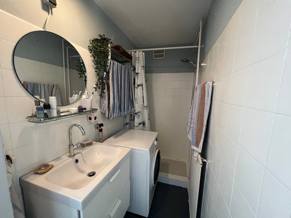 Badkamer voorzien van wastafel, douche en wasmachineaansluiting.