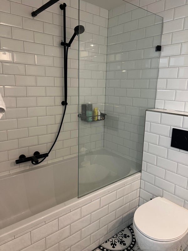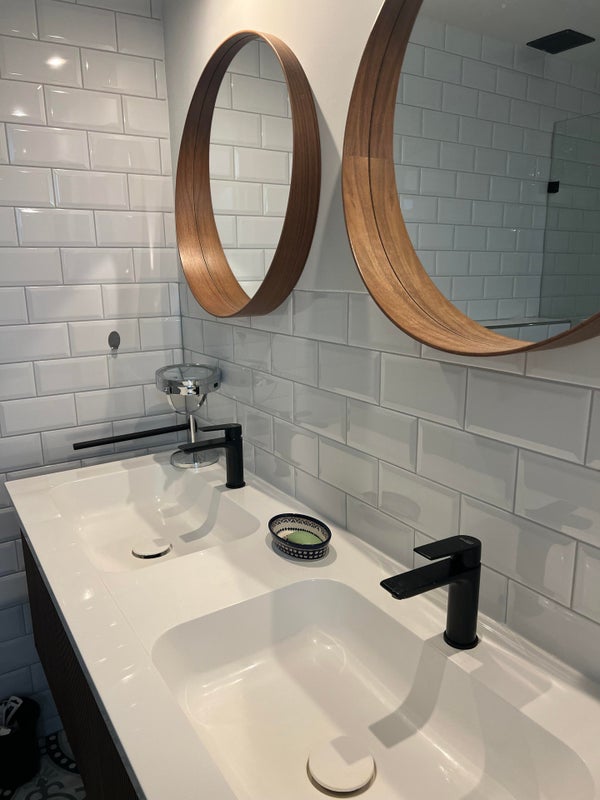 1e etage: Drie ruime slaapkamers en een luxe badkamer met bad, toilet en dubbele wastafel.