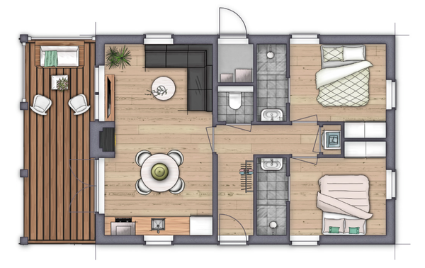 De bungalow is geschikt voor 2 – 4 personen en is geheel gelijkvloers.