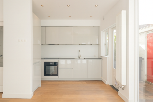Begane grond: Entree, hal, verdiepte kelderkast, toiletruimte met vrijdragend toilet en fonteintje. De woonkamer is opvallend licht en biedt via openslaande deuren direct toegang tot de zonnige tuin. De gloednieuwe open keuken heeft eveneens een deur naar buiten.