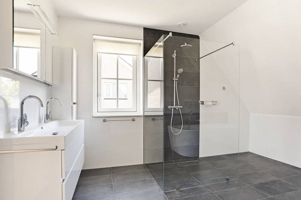 De tweede badkamer biedt hetzelfde niveau van comfort en stijl, uitgerust met een dubbele wastafel, een wandtoilet, een royale inloopruimte en een ruime inloopdouche.