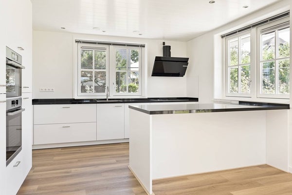 Eenmaal in de woonkamer met zijn open keuken en grote ramen rondom, zult u meteen het extra ruime gevoel opmerken dat het toevoegt aan deze al grote en huiselijke ruimte. De luxe open keuken beschikt over een eiland en is uitgerust met hoogwaardige Bosch apparaten, waaronder een elektrisch inductiekookplaat, afzuigkap, vaatwasser, oven, koelkast-vriezer en voldoende kastruimte. De woonkamer heeft hoogwaardige PVC-vloeren en is voorzien van vloerverwarming.