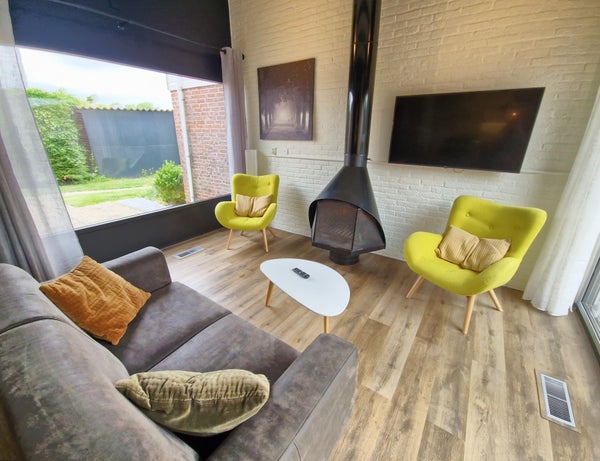 Woonkamer-plavuizen, flatscreen TV , 1 bank, salontafel, eettafel, open haard