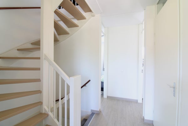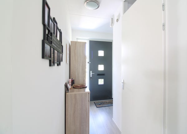Entree naar de hal welke toegang geeft tot een ruime woonkamer met open keuken. De volledige beneden verdieping is voorzien van een nette laminaatvloer.