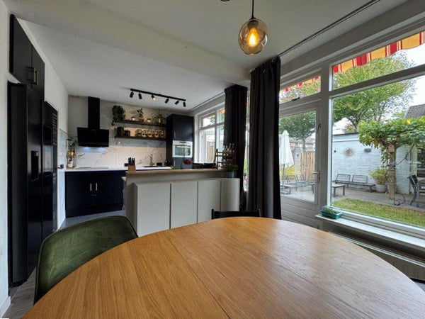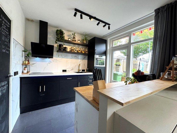 De open keuken ligt aan de tuinzijde en is uitgevoerd in een moderne stijl met zwarte fronten, RVS-handgrepen, marmerlook achterwand en een houten werkblad. De keuken beschikt over een inductiekookplaat, afzuigkap, oven, koelkast en vaatwasser.