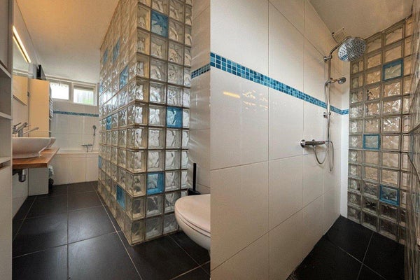 De badkamer is volledig betegeld in wit met blauwe accenten en ingericht met een inloopdouche, ligbad, dubbele wastafel met meubel en een tweede toilet.