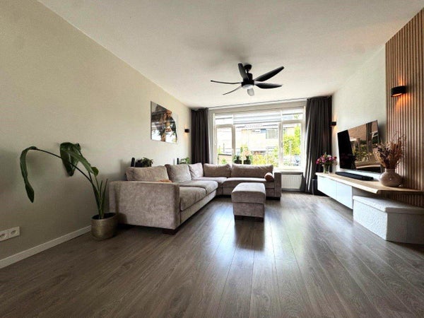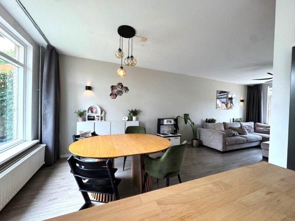 De woonkamer is licht en strak afgewerkt met een laminaatvloer, gestuukte wanden en een sfeervolle wand met houten latten. Aan de achterzijde bevindt zich de eethoek met grote raampartijen en een deur naar de tuin.