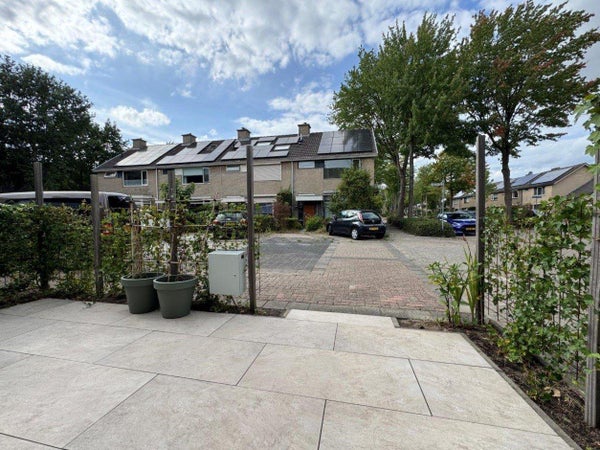 De achtertuin ligt op het westen en is onderhoudsvriendelijk aangelegd met sierbestrating, een overkapping met pergola, groenbegroeiing en een garage met garagedeur aan de straatzijde.