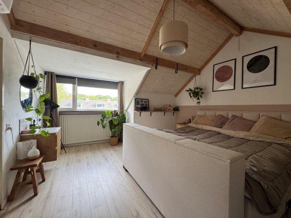 De zolderkamer is sfeervol ingericht met een dakkapel, zichtbare balken en veel lichtinval.