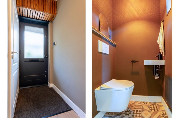 Bij binnenkomst in de woning stap je binnen in de hal, waar je toegang hebt tot de meterkast, het toilet, de trapopgang naar de eerste verdieping.