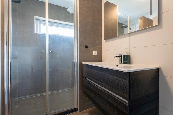 Op de eerste verdieping bevinden zich twee ruime slaapkamers en een kastenkamer, die allemaal zijn voorzien van vloerbedekking en een strakke wandafwerking. De badkamer is modern en praktisch ingericht. Hier vind je een toilet, een wastafel en een dubbele douche. Tevens bevindt zich hier ook de wasmachine. Dankzij de natuurlijke ventilatie blijft de ruimte fris en goed geventileerd.