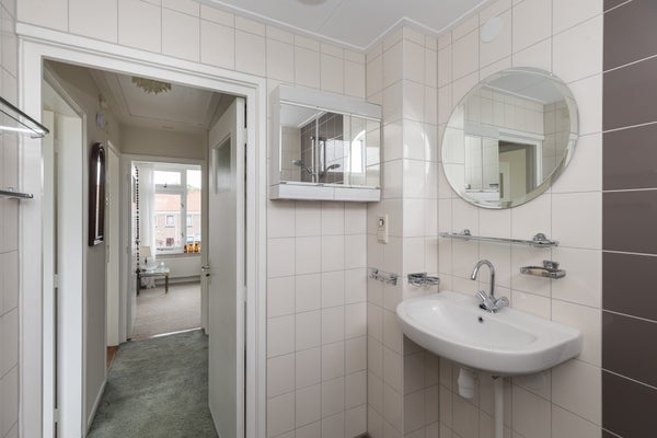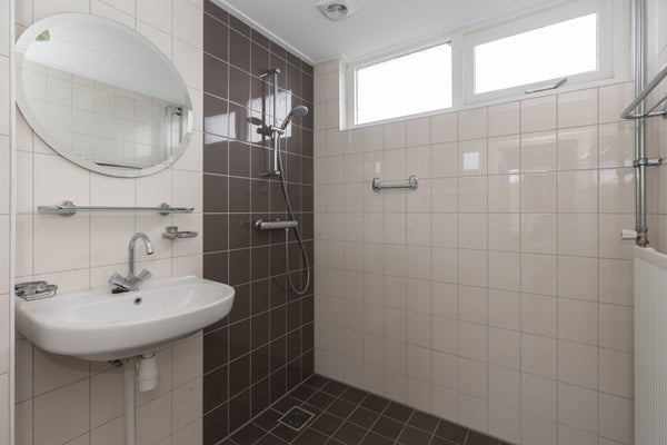 Op de 1e verdieping bevinden zich 3 (slaap/werk)kamers (14, 11 en 5 m2) en een badkamer met douche en wastafel.