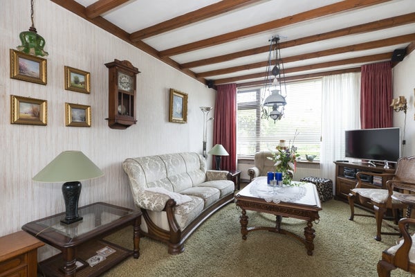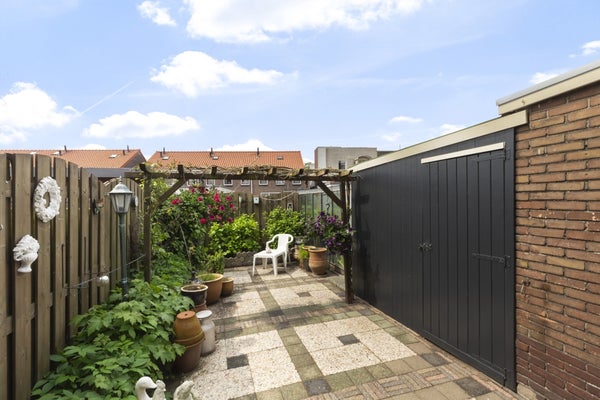 Vanuit de bijkeuken gaat u vervolgens naar de ruime achtertuin met achterom en een schuur voor bijvoorbeeld fietsen en een apart druivenhok. Door de gunstige ligging heeft u hier de hele dag zon.
