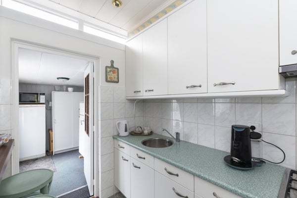 De woning heeft een ruime voortuin, waar u ook heerlijk kunt zitten. Entree in de hal met het toilet en een bergkast onder de trap. Vanuit de hal komt u in de keuken en vandaaruit in de woon-/eetkamer (totaal bijna 32 m2). Als u via de hal naar de achterzijde van de woning loopt, komt u in de keuken. De keuken is voorzien van een gasfornuis met oven/magnetron en veel kastruimte. Via de keuken komt u in de bijkeuken. In de bijkeuken bevinden zich de koelkast, vriezer, wasmachine en droger