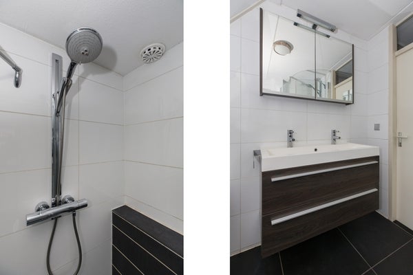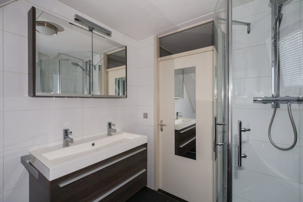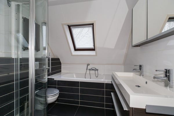 Overloop met vaste trapopgang naar de twee verdieping en toegang tot drie slaapkamers en de badkamer. In de slaapkamers ligt tevens een fraaie laminaatvloer. Luxe badkamer in wit/zwarttinten met ligbad, zwevend toilet en dubbel wastafel.