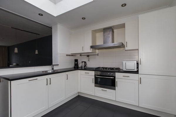 Ontvangsthal met ruime kast, en toegang tot de royale woonkamer met open keuken. De woonkamer beschikt over een laminaatvloer, trapkast en toegang tot de achtertuin met berging. Moderne, witte keuken met kunststof werkblad en diverse inbouwapparatuur, waaronder een 4-pits gasfornuis, afzuigkap, oven, vaatwasser en koelkast. Vanuit de keuken is er toegang tot de bijkeuken en het toilet.