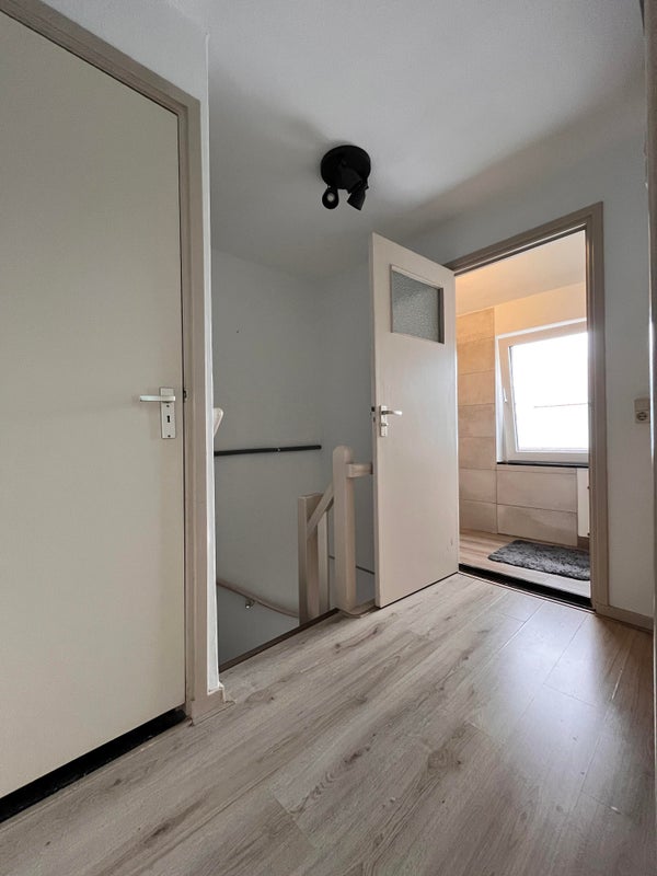 Overloop met toegang tot drie slaapkamers en badkamer. Alle slaapkamers zijn voorzien van dezelfde lichte laminaatvloer.