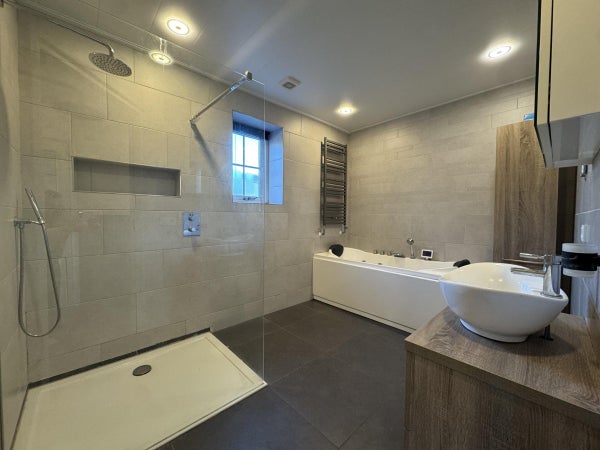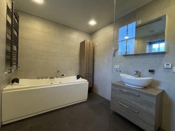 Badkamer voorzien van ligbad, wastafel met meubel, handdoekradiator en inloopdouche.