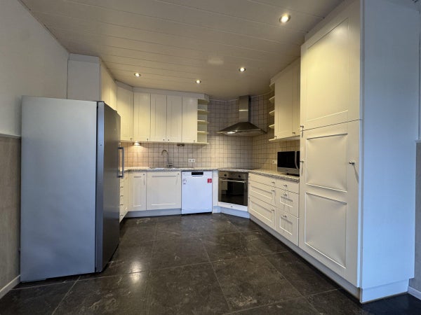 Woonkeuken met eenvoudige keukeninrichting waaronder een koelkast, elektrische kookplaat, een oven, een afzuigkap en een vaatwasser. Vanuit de woonkeuken bereik je een portaal met toegang tot de ruime woonkamer en een werk / studeerkamer.