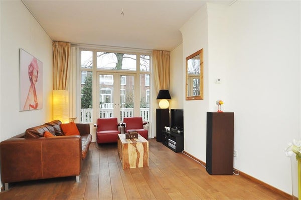 Ruime overloop met diepe vaste kast. Modern toilet. Smaakvolle en fraaie woonkamer en-suite van ca. 32 m2 (ca. 4.80 x 3.32 en 4.80 x 3.32 m) met massieve eiken 22 mm. dikke vloerdelen, schuifseparatie met 4 vaste kasten en openslaande deuren naar zowel het balkon aan de voorzijde als aan de achterzijde. Met de prettige plafondhoogte van bijna 2.90 m is het een zeer lichte woonkamer.