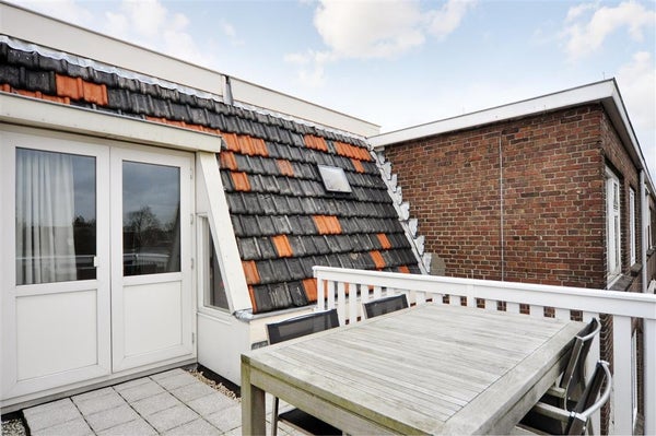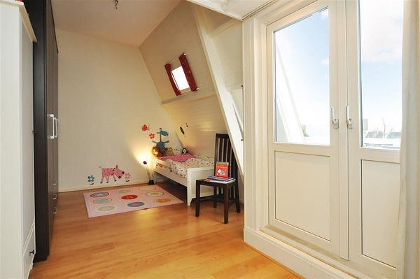 Achterkamer (ca. 5.35 x 2.50 m) met bergvliering, vaste kast en openslaande deuren naar dakterras van 11 m2 (ca. 3.88 x 2.97m).