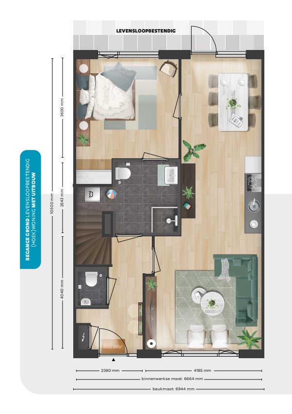 Deze moderne levensloopbestendige woning aan de Ellingtonstraat 77 in Roermond is per 1 april beschikbaar. De woning is instapklaar en gelegen in het duurzame project MorgenWonen. Wonen, slapen en de badkamer zijn op de begane grond, met twee extra slaapkamers op de verdieping. De luxe keuken is ingericht met moderne apparatuur en de badkamer beschikt over een inloopdouche en Villeroy & Boch sanitair. De woning omvat een ruime tuin met terras en een eigen parkeerplaats. Met een totale oppervlakte van circa 105 m² biedt het comfort en duurzaamheid, zoals vloerverwarming en zonnepanelen. Sjtadshaof is een kindvriendelijke wijk met groenvoorzieningen en een goede verbinding met het stadscentrum.