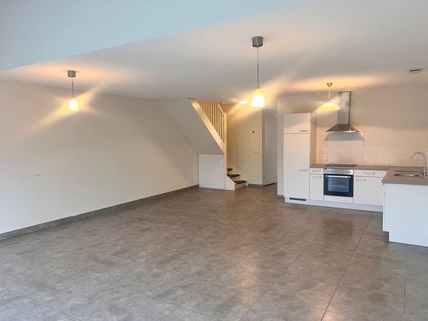 De ruime woonkamer staat in open verbinding met de keuken, die is uitgerust met een koelkast, oven, 4-pits kookplaat en afzuigkap. De gehele begane grond is afgewerkt met een onderhoudsvriendelijke plavuizenvloer.