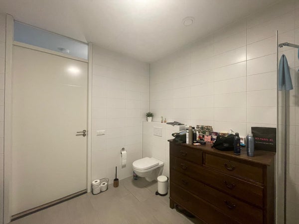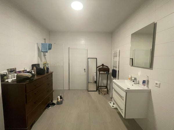 De ruime badkamer is luxe en praktisch ingericht met een aparte douche, handdoekradiator, een tweede toilet, een wastafel en bijpassend badkamermeubel.