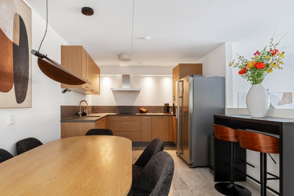De woonkamer is volledig voorzien van een marmeren vloer met vloerverwarming en wordt gescheiden door middel van een verlaging. Open keuken in lichte kleurstelling welke voorzien is van diverse inbouwapparatuur zoals; koelkast, vrieskast, afzuigkap, vaatwasser, oven, magnetron en kookplaat. (NIEUW!)
