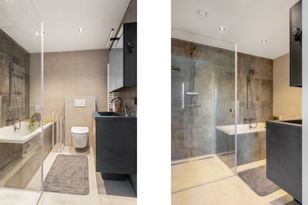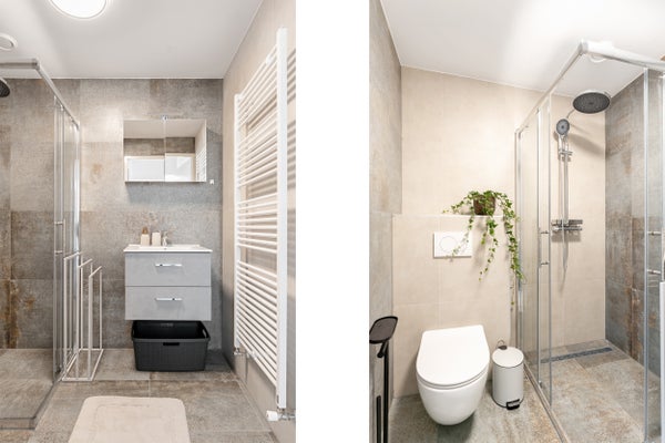 De 2e badkamer is voorzien van een douche, toilet en wastafel.